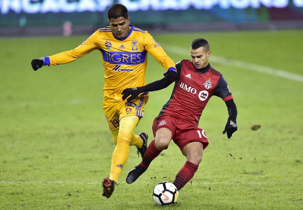 Toronto FC forward Sebastian Giovinco battles UANL Tigres midfielder Larry Vasquez at the CONCACAF Champions League quarter-final in Toronto on March 7, 2018.Frank Gunn
