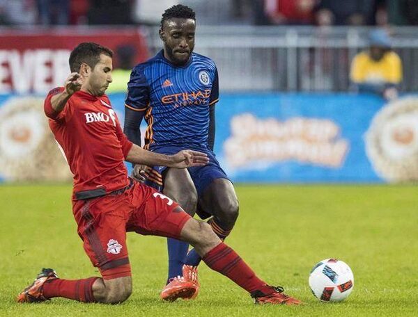 Toronto FC's Steven Beitashour, left, kicks the ball away from New York City FC's Stiven Mendoza in Toronto, Wednesday May 18, 2016.Mark Blinch/The Canadian Press