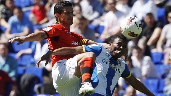 Espanyol's Kalu Uche, right, fights for the ball with Valencia's Ricardo Costa during their Spanish first division soccer league match at Cornella-El Prat stadium, near Barcelona on Sunday.ALBERT GEA