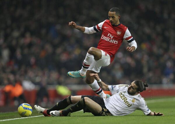 Arsenal's Theo Walcott leaps over the challenge of Swansea City's Chico Flores during their English FA Cup replay soccer match at Arsenal's Emirates stadium in London, Wednesday, Jan. 16, 2013.Alastair Grant/The Associated Press
