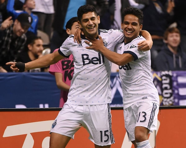 Vancouver Whitecaps midfielder Matias Laba celebrates his second goal against the Los Angeles Galaxy with midfielder Cristian Techera, during the second half at B.C. Place in Vancouver, on April 1, 2017.Anne-Marie Sorvin