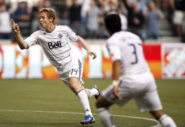 Barry Robson of the Vancouver Whitecaps celebrates his goal against the L.A. Galaxy during the first half of their MLS game in Vancouver, British Columbia July 18, 2012.BEN NELMS/Reuters