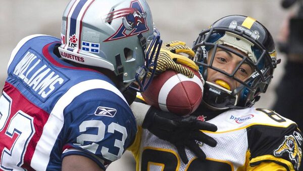 Montreal Alouettes Seth Williams interrupts a pass intended for Hamilton Tiger-Cats Chris Williams during the second half of their CFL football game in Montreal.CHRISTINNE MUSCHI/Reuters