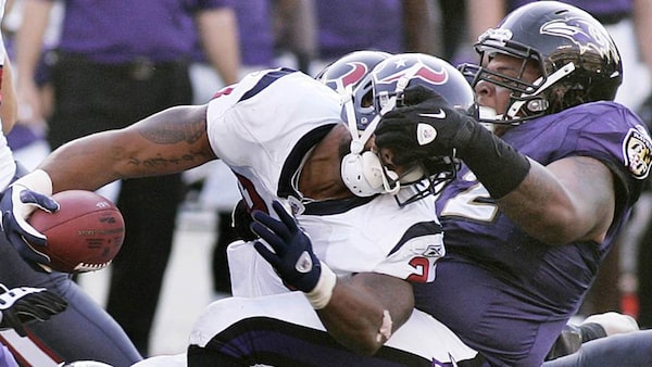 Baltimore Ravens' nose tackle Terrence Cody makes the tackle on Houston Texans' running back Arian Foster for no gain on a fourth and one play during the second quarter of their NFL football game in Baltimore.JOE GIZA/Reuters