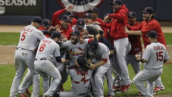 The St. Louis Cardinals celebrate after Game 6 of baseball's National League championship series against the Milwaukee Brewers Sunday.Jeff Roberson/The Associated Press