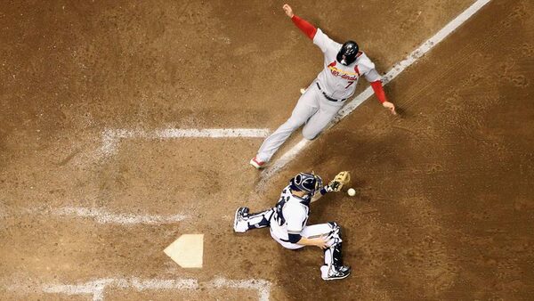 Matt Holliday of the St. Louis Cardinals scores on a sacrifice fly by Nick Punto in the top of the third inning against catcher Jonathan Lucroy of the Milwaukee Brewers during Game 6 of the National League Championship Series at Miller Park.Christian Petersen