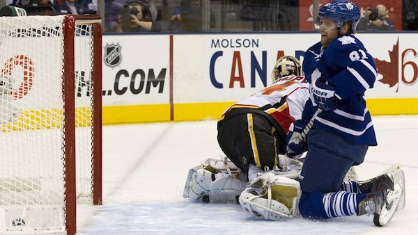 Toronto Maple Leafs' Phil Kessel scores on Calgary Flames goalie Miika Kiprusoff during second period NHL hockey action in Toronto on Saturday.Chris Young/The Canadian Press