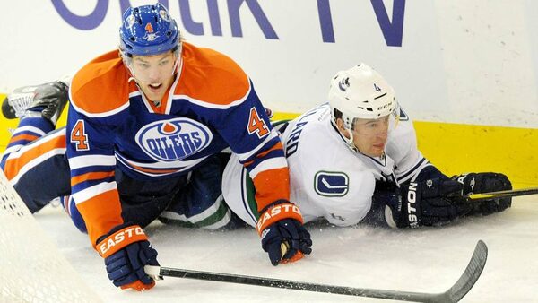 Edmonton Oilers' Taylor Hall falls on the Vancouver Canucks' Keith Ballard during first period NHL hockey action in Edmonton on Saturday.John Ulan/The Canadian Press