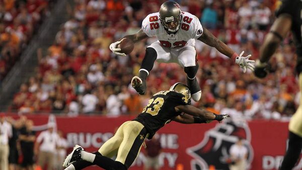 Tampa Bay Buccaneers tight end Kellen Winslow jumps over New Orleans Saints cornerback Jabari Greer.Kim Klement-US PRESSWIRE