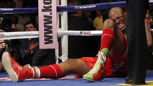 Bernard Hopkins complains of a shoulder injury as Chad Dawson wins by technical knockout in the second round during their WBC light heavyweight title bout in Los Angeles.ALEX GALLARDO/Reuters