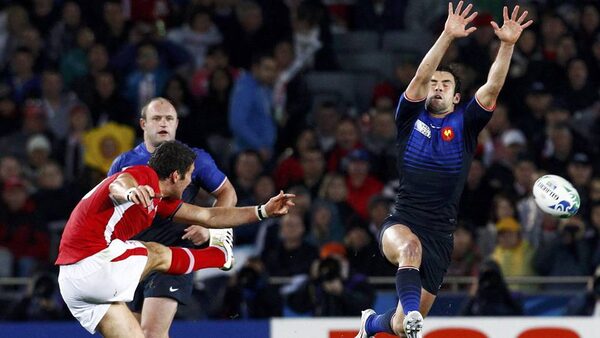 France's Morgan Parra attempts to block a kick from Wales' James Hook during their Rugby World Cup semi-final match at Eden Park in Auckland .DAVID GRAY/Reuters
