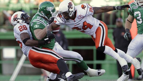Saskatchewan Roughriders slotback Andy Fantuz, centre, gets taken down by BC Lions defensive back J.R. Ruffin and defensive back Korey Banks.DAVID STOBBE/Reuters