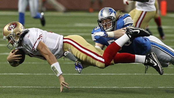 Bobby Carpenter of the Detroit Lions dives to tackle Alex Smith of the San Francisco 49ers.Dave Reginek
