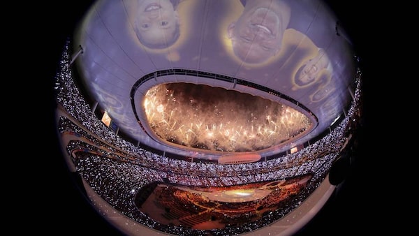 Faces are projected on the roof as fireworks explode over Omnilife Stadium in this fisheye lens view during the opening ceremony of the Pan American Games in Guadalajara.DESMOND BOYLAN/Reuters