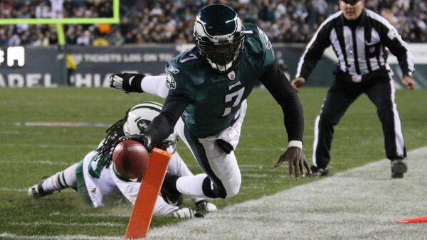 Philadelphia Eagles quarterback Michael Vick dives for a touchdown after eluding a tackle by New York Jets defensive back Kyle Wilson.Rob Christy-US PRESSWIRE
