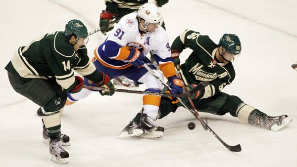 New York Islanders centre John Tavares (91) battles for the puck with Minnesota Wild left wing Darroll Powe (14) and defenseman Nick Schultz (55) during the first period in an NHL hockey game, Saturday.PAUL BATTAGLIA/The Associated Press