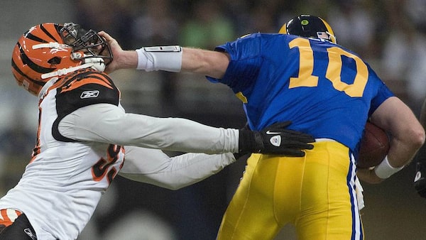 St. Louis Rams quarterback Kellen Clemens stiff arms Cincinnati Bengals defensive end Michael Johnson in the second half at the Edward Jones Dome.Jeff Curry-US PRESSWIRE