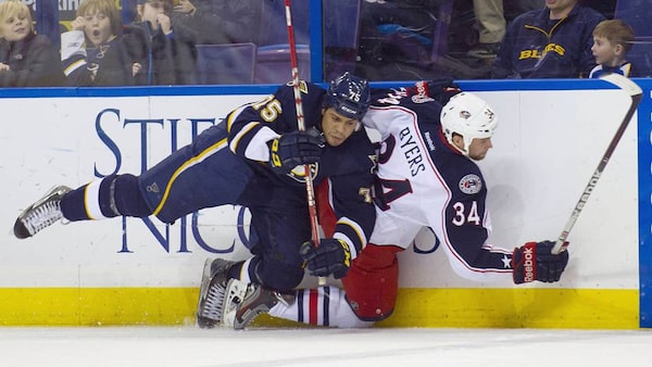 St. Louis Blues right wing Ryan Reaves checks Columbus Blue Jackets left wing Dane Byers during the first period at the Scottrade Center.Scott Rovak-US PRESSWIRE