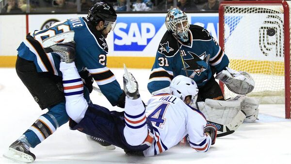 San Jose Sharks goalie Antti Niemi, of Finland, right, deflects a shot attempt byt Edmonton Oilers left wing Taylor Hall (4) as defenseman Dan Boyle (22) looks on during the second period of an NHL hockey game in San Jose, Calif., Saturday.Marcio Jose Sanchez