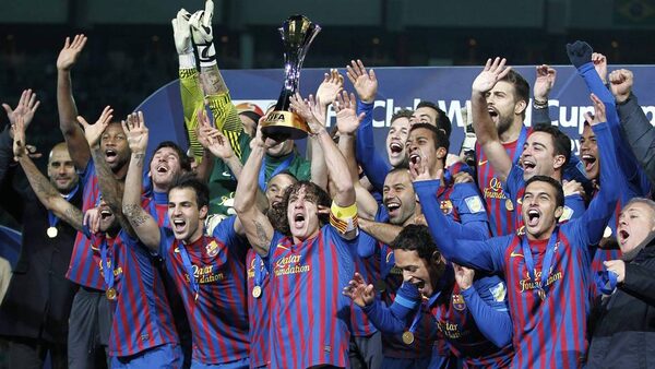 Captain Carles Puyol of Spain's Barcelona holds the trophy on the podium after winning their Club World Cup final soccer match against Brazil's Santos in Yokohama, south of Tokyo.YURIKO NAKAO/Reuters