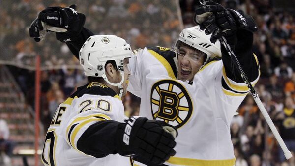 Boston Bruins' Zach Hamill, right, and Daniel Paille celebrate after Paille's goal in the first period of an NHL hockey game against the Philadelphia Flyers, Saturday.Matt Slocum/The Associated Press