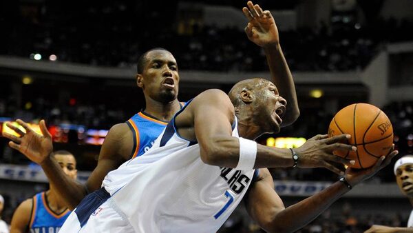 Dallas Mavericks power forward Lamar Odom (7) drives the lane as Oklahoma City Thunder power forward Serge Ibaka (9) defends during the first quarter at the American Airlines Center.Jerome Miron-US PRESSWIRE