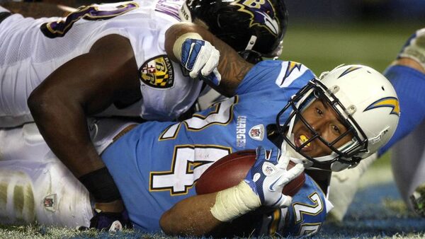 Running back Ryan Mathews of the San Diego Chargers runs the ball in for a touchdown against the Baltimore Ravens during their NFL game at Qualcomm Stadium in San Diego.Donald Miralle