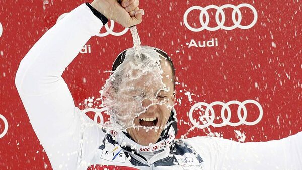 Massimiliano Blardone of Italy celebrates on the podium after winning the men's World Cup giant slalom race in Alta Badia, northern Italy.MAX ROSSI/Reuters