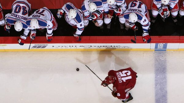Boyd Gordon of the Phoenix Coyotes skates the puck past the bench of the New York Rangers during the NHL game at Jobing.com Arena in Glendale, Arizona.Christian Petersen