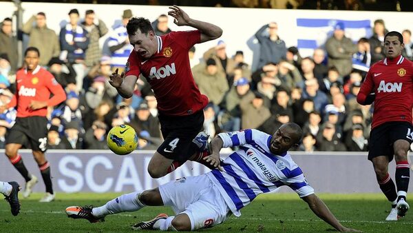 Queens Park Rangers' Danny Gabbidon (R) challenges Manchester United's Phil Jones during their English Premier League soccer match at Loftus Road Stadium in London.DYLAN MARTINEZ/Reuters