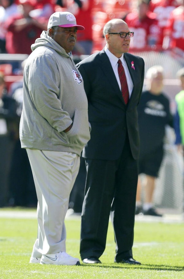 FILE - In this Oct. 7, 2012, file photo, Kansas City Chiefs head coach Romeo Crennel, left, and general manager Scott Pioli watch the team warm up prior to an NFL football game against the Baltimore Ravens in Kansas City, Mo. Police say Chiefs player Javon Belcher fatally shot his girlfriend early Saturday, Dec. 1, 2012, in Kansas City, Mo., then drove to Arrowhead Stadium and committed suicide in front of his coach and general manager.Ed Zurga/The Associated Press