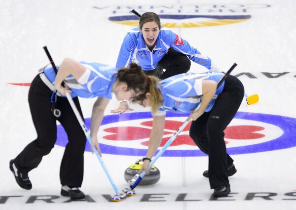 Quebec skip Emilia Gagne, middle, calls the sweep as they play Alberta at the Scotties Tournament of Hearts in Penticton, B.C., Jan. 31, 2018.Sean Kilpatrick/The Canadian Press