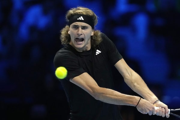 Germany's Alexander Zverev returns the ball to Spain's Carlos Alcaraz during their singles tennis match of the ATP World Tour Finals at the Pala Alpitour, in Turin, Italy, on Nov. 13, 2023.Antonio Calanni/The Associated Press