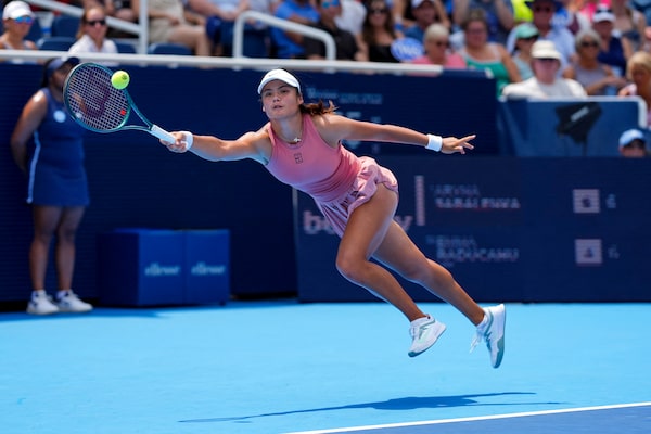 Emma Raducanu returns a shot against Aryna Sabalenka during the Cincinnati Open at the Lindner Family Tennis Center.Aaron Doster/Reuters
