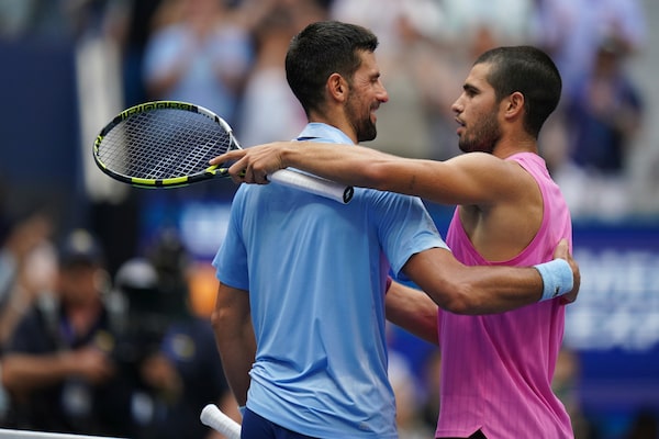 Carlos Alcaraz congratulates Novak Djokovic after defeating him in the U.S. Open semifinals, on Friday.Vera Nieuwenhuis/The Associated Press
