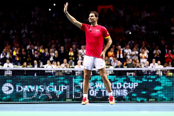 Rafael Nadal of Team Spain waves to the spectators as he leaves the court during his farewell after Spain being knocked out on the quarterfinal tie between Netherlands and Spain during the Davis Cup Finals at Palacio de Deportes Jose Maria Martin Carpena on Nov. 19, 2024 in Malaga, Spain.Matt McNulty/Getty Images