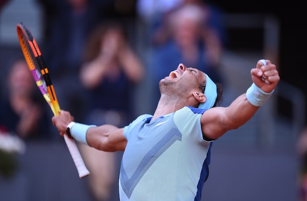 Rafael Nadal celebrates after defeating David Goffin at the Madrid Open, on May 5.Denis Doyle/Getty Images