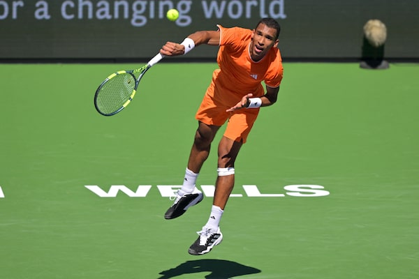 Félix Auger-Aliassime serves during his fourth round match against Arthur Fils in the BNP Paribas Open at the Indian Wells Tennis Garden on Tuesday.Jayne Kamin-Oncea/Reuters