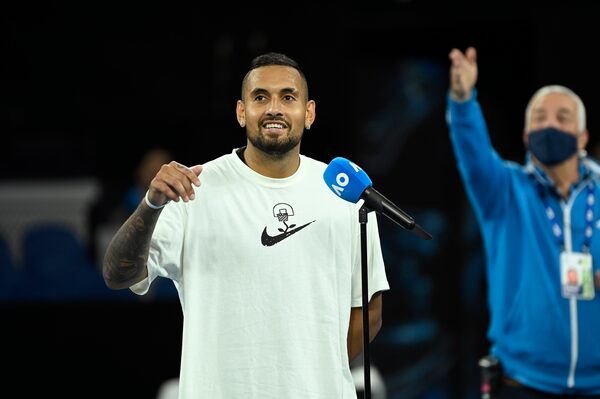 Nick Kyrgios speaks to the crowd after winning his first-round match against Frederico Ferreira Silva.JAIMI JOY/Reuters