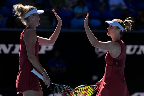 Canada's Gabriela Dabrowski, right, reacts with partner Erin Routliffe of New Zealand during their women's doubles semifinal against Hsieh Su-Wei of Taiwan and Jelena Ostapenko of Latvia at the Australian Open tennis championship in Melbourne, Australia, Friday, Jan. 24, 2025.Ng Han Guan/The Associated Press