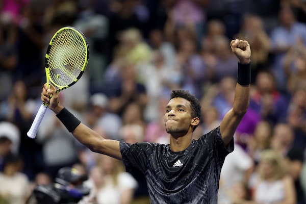Felix Auger-Aliassime of Canada reacts after winning against Frances Tiafoe of the United States during his Men’s Singles round of 16 match on Day Seven at USTA Billie Jean King National Tennis Center on Sept. 5, 2021 in New York.Matthew Stockman/Getty Images
