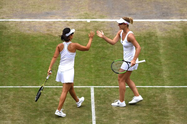 Gabriela Dabrowski and Xu Yifan celebrate during their semi-final match against Barbora Krejcikova and Katerina Siniakova at Wimbledon on July 12, 2019.Shaun Botterill/Getty Images