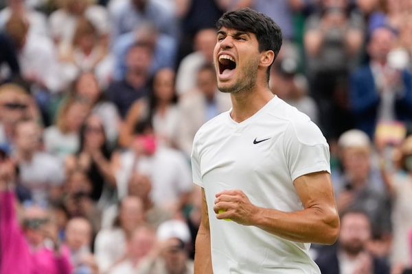 Carlos Alcaraz of Spain reacts during his fourth round match against Ugo Humbert of France at the Wimbledon tennis championships in London on July 4.Alberto Pezzali/The Associated Press