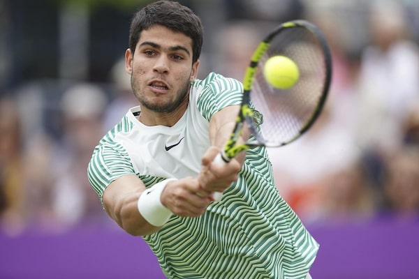 Carlos Alcaraz hits a return during a match at the Queen's Club Championships, in London, on June 20.The Canadian Press