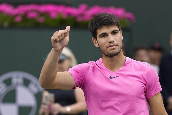 Carlos Alcaraz celebrates after defeating Daniil Medvedev in the men's singles final at the BNP Paribas Open, in Indian Wells, Calif., on March 19.The Associated Press