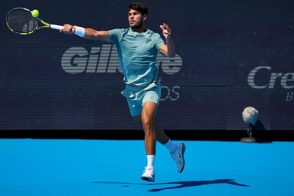 Carlos Alcaraz returns a shot against Jannik Sinner during the Cincinnati Open's men's singles championship match at the Lindner Family Tennis Center.Aaron Doster/Reuters