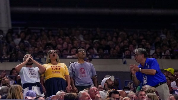 Protestors disrupt play between Coco Gauff, of the United States, and Karolina Muchova, of the Czech Republic, during the women's singles semifinals of the U.S. Open tennis championships, on Sept. 7 in New York.Manu Fernandez/The Associated Press