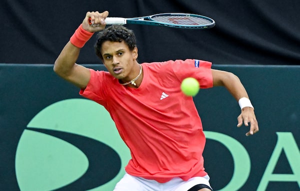 Gabriel Diallo, of Canada, plays a shot to Fabian Marozsan, of Hungary, during their Davis Cup qualifying match in Montreal in February.Graham Hughes/The Canadian Press