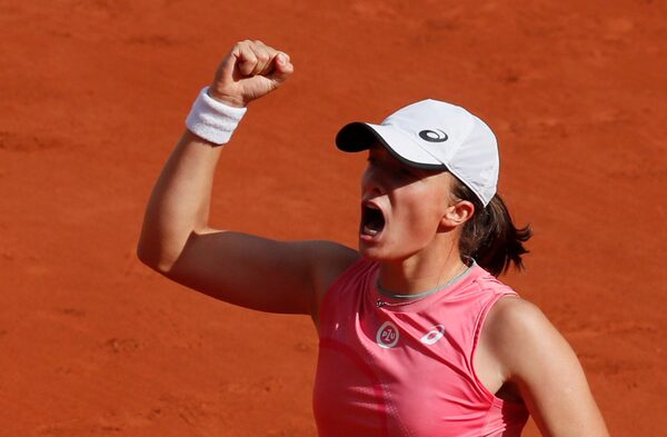 Poland's Iga Swiatek celebrates after winning her third-round match against Estonia's Anett Kontaveit at Roland Garros on June 5, 2021.GONZALO FUENTES/Reuters