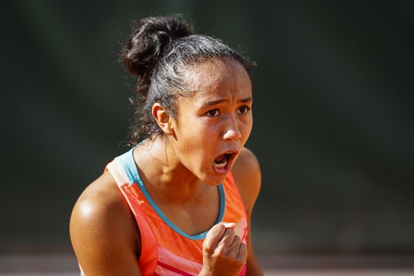 Leylah Annie Fernandez celebrates after winning a point against Polona Hercog during their second-round match at the French Open in Paris on Oct. 1, 2020.THOMAS SAMSON/AFP/Getty Images